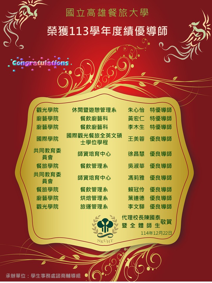 ~喜賀~榮獲113學年度績優導師,感謝全體導師對學生輔導工作的辛勞與奉獻!